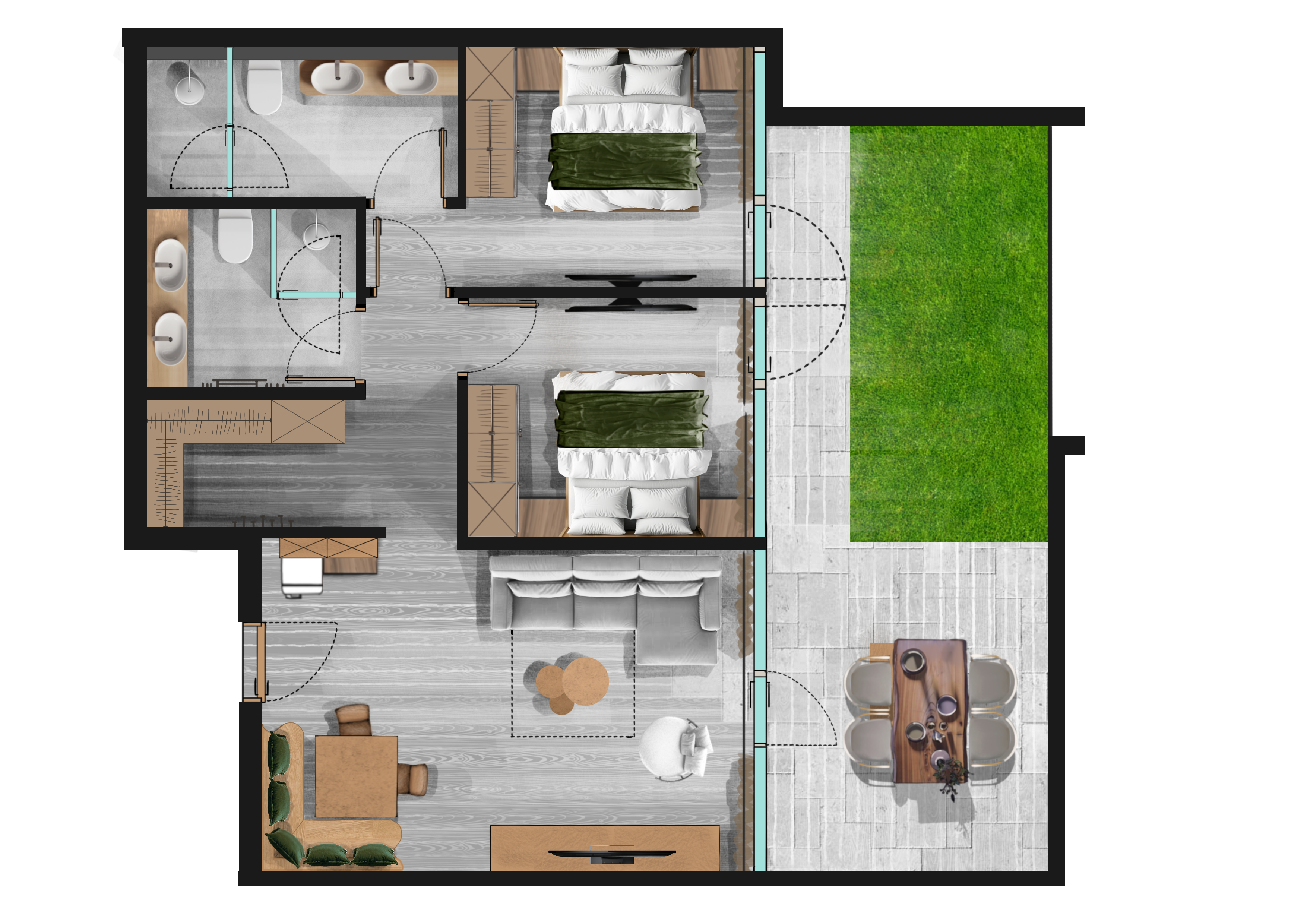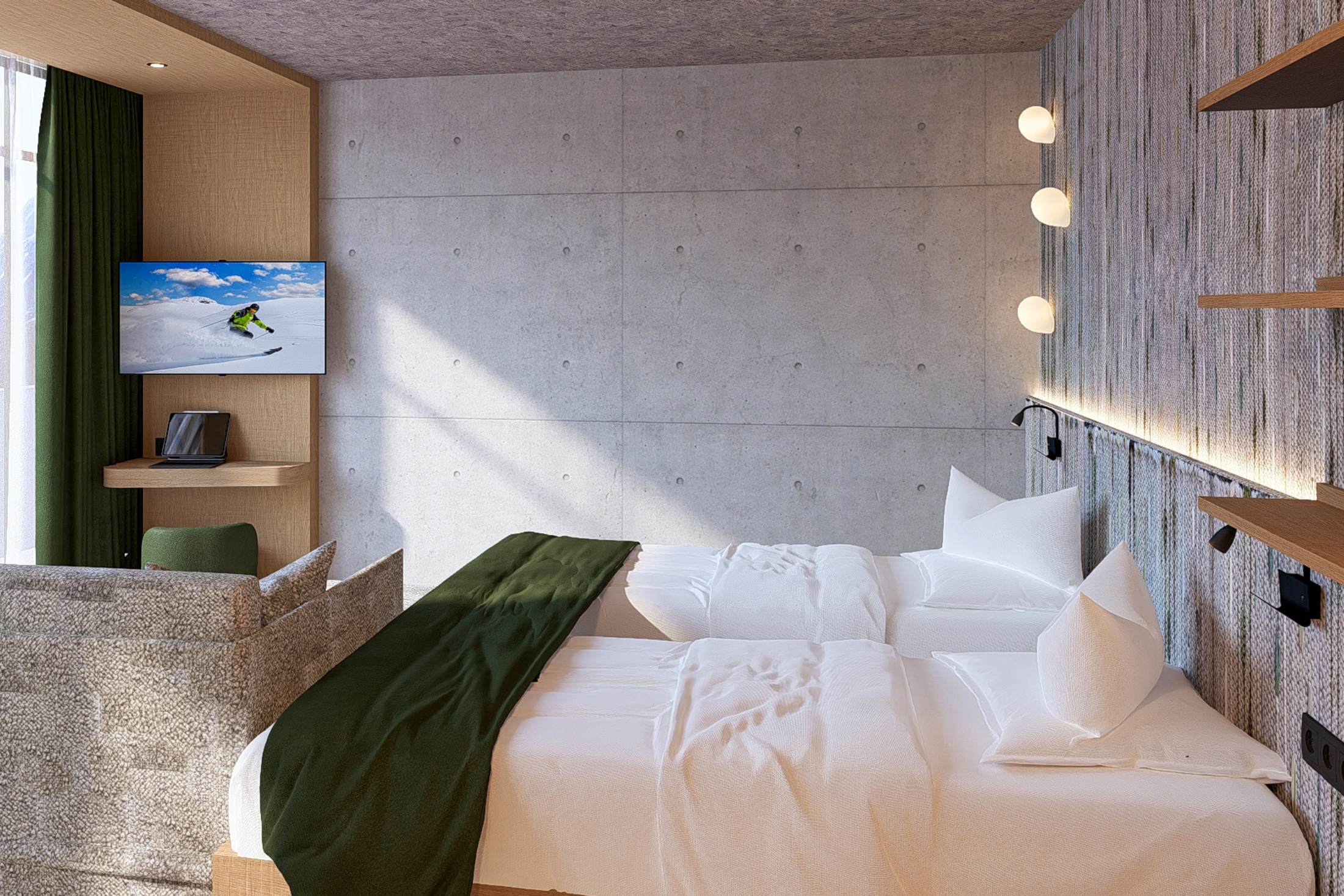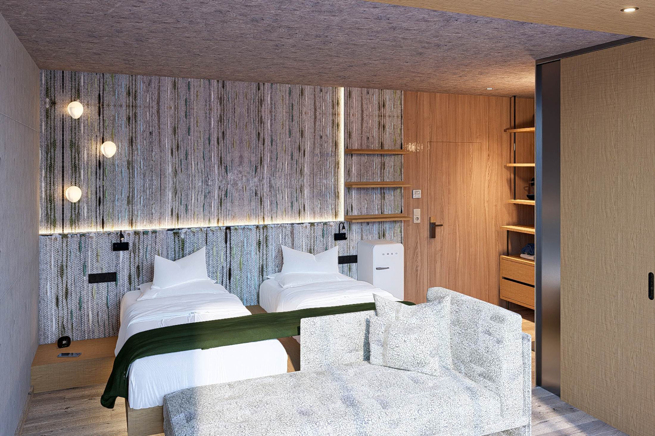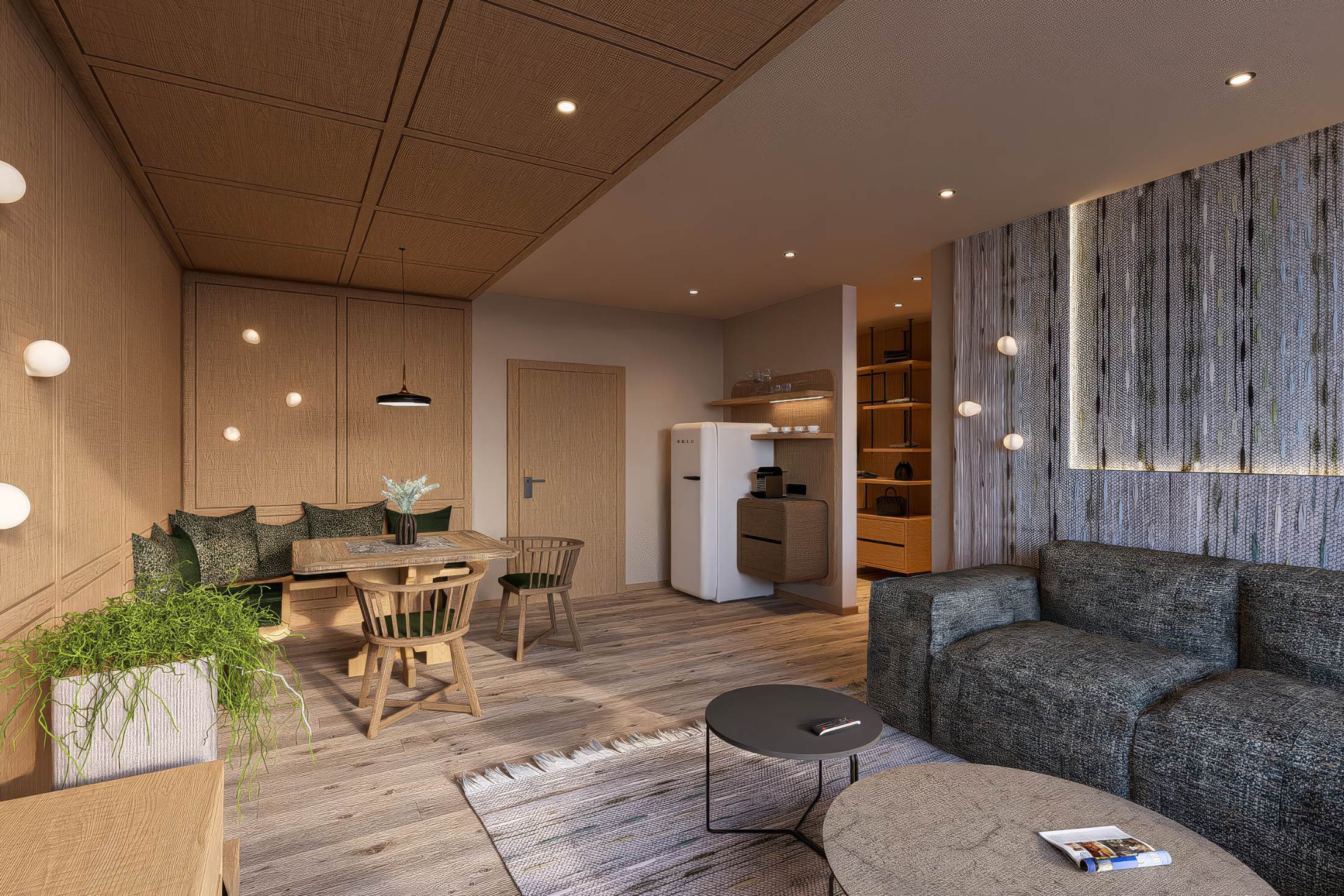 Living with direct access to nature. This stylish ground-floor garden suite offers 80 m² of comfortable living space with two separate bedrooms and a spacious living area, creating an ideal holiday home for couples, families, or friends. It is filled with morning sunshine and features a charming view of the village and the neighboring houses. Direct access to the garden creates a special connection to nature and gives the suite a calm, private atmosphere. The harmonious combination of thoughtful layout, modern design, and high-quality comfort makes this suite an ideal retreat for relaxing and unforgettable days.