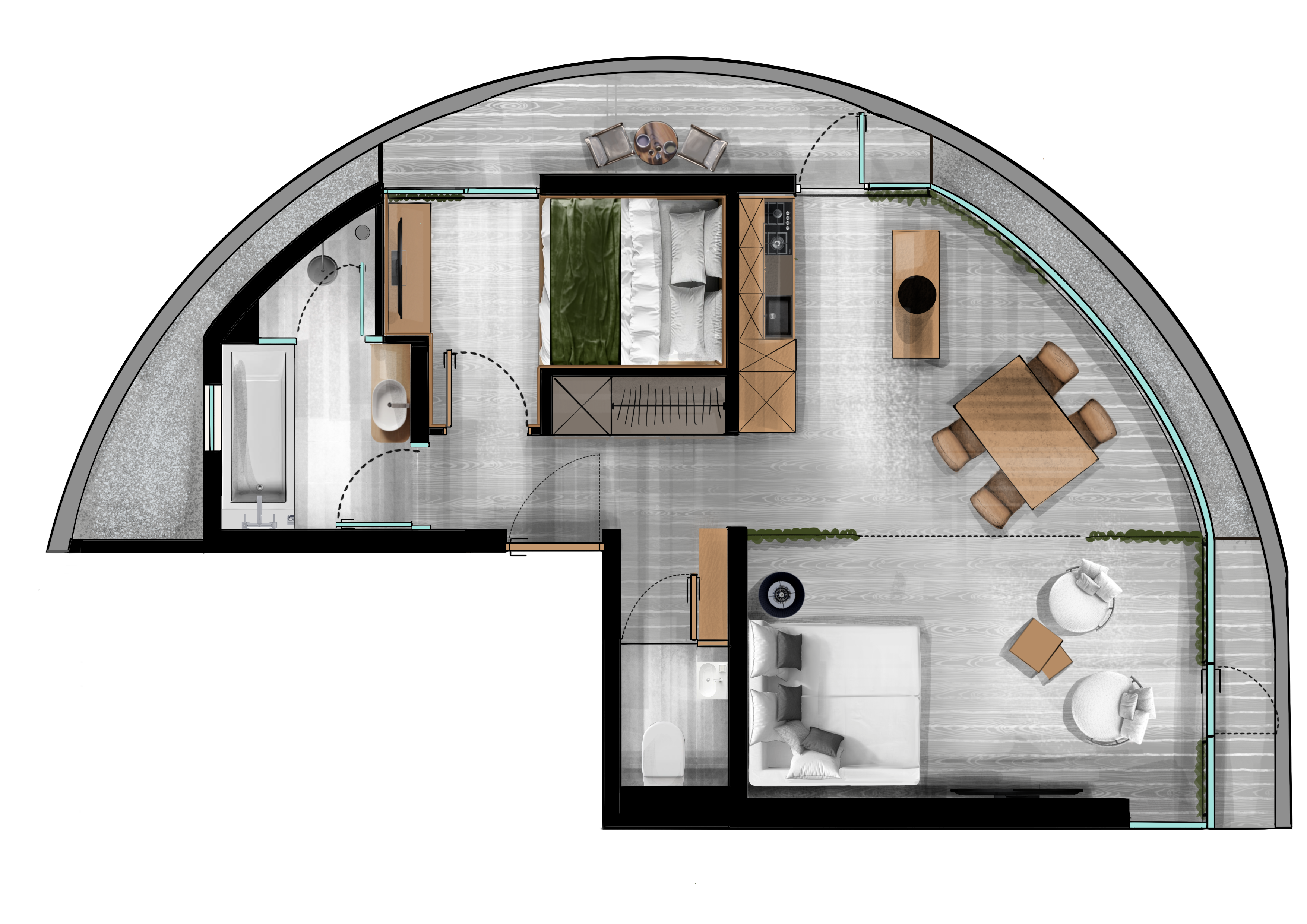 One bedroom, a living area with sofa bed, kitchen, dining table, wardrobes, comfortable seating area, one bathroom with rain shower and bathtub, separate toilet, free Wi-Fi, 40" Smart TV, safe, telephone, and a private balcony.